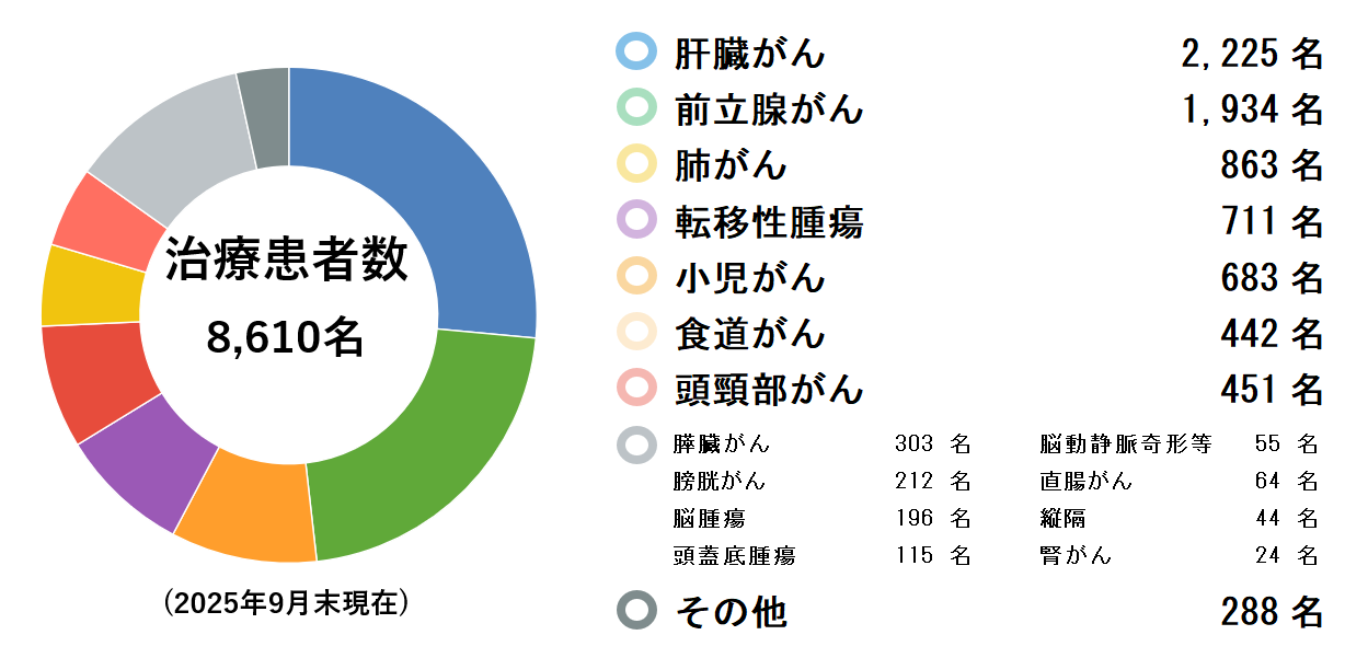 1983年から2000年までの間にKEK(現・高エネルギー加速器研究機構)で治療した実績を含め、2025年9月末までに8,610名の患者さんを治療しました。そのうち最も多い疾患が肝臓がんで、前立腺がん、肺がんの順となっています。当センターでは、陽子線治療が有効性を発揮できる腫瘍であれば、あらゆる疾患の治療に対応しています。